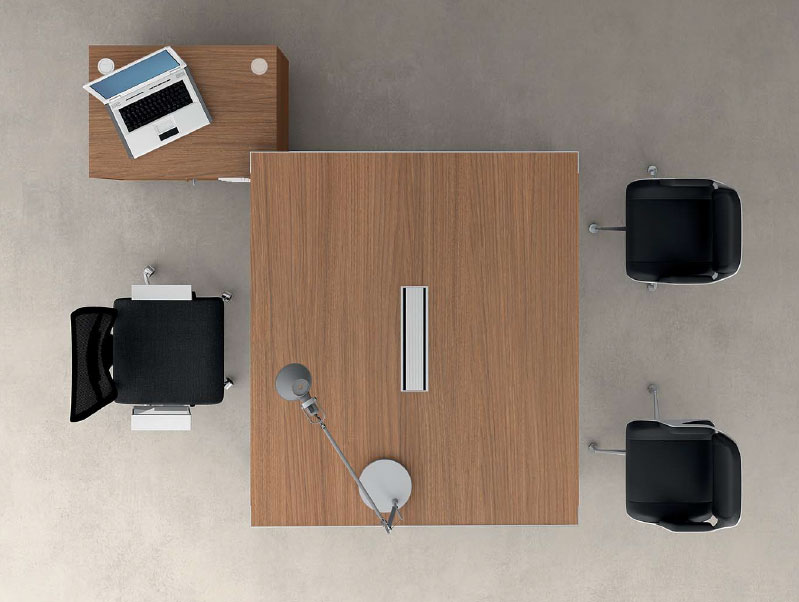 Plans de travail bois et verre : Réalisés en panneaux de particules de bois mélaminés épaisseur 18mm, anti-reflet et anti-rayures. Les côtés longs ont le chants en ABS épaisseur 1,5mm. Les côtés courts ont un chant aluminium de 10mm d’épaisseur. Les plans des tables de réunion profondeur 140cm sont équipés de câblage par top access. Les plans en verre sont réalisés en verre trempé extra clair épaisseur 10 mm satiné sur le côté supérieur (anti-trace et anti-rayures) et vernis sur le côté inférieur. Les angles sont arrondis à 45°. Structures : Les pieds sont disponibles en version «Arche» ou ponts, réalisés en acier épaisseur 2mm, vernis à poudres polyester mat, avec effet «soft touch», anti-trace et anti-rayures ou chromé. Tous les pieds sont équipés d’un vérin de réglage. Câblage : Les grilles pour le rassemblement des câbles sont réalisées en fil d’acier vernis en couler argent diamètre 3 et 5 mm. Elles sont soutenues par des supports en acier vernis époxy qui permettent le décrochage du côté extérieur : le positionnement des câbles se fait par pivotement de la grille vers le bas. La vertèbre pour la gestion verticale des câbles, repose sur le sol et est fixée sous le plan de travail