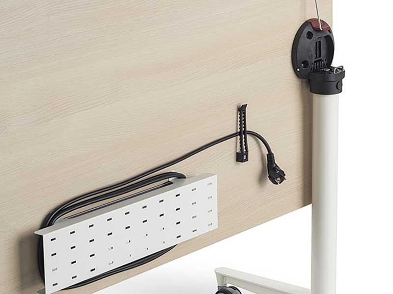 Plateaux Mélaminé ou Stratifié anti-bactériens, épaisseur 30 mm, avec chant en ABS 2 mm. Piétements en acier peint époxy équipés de 4 roulettes freiN. Les tables disposent d’un mécanisme permettant de rabattre le plateau en position verticale. Hauteur 73,5 cm.