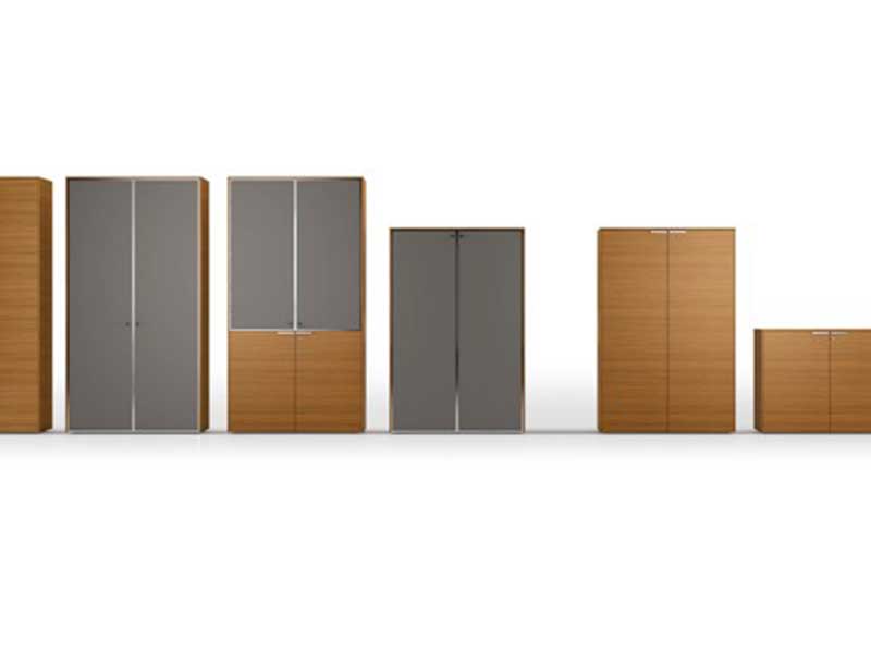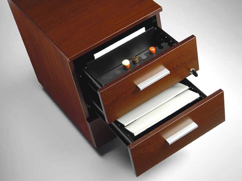 Structure en aggloméré de 18 mm d’épaisseur, revêtue à l’extérieur de papier peint en finition noire, imprégné de résines mélaminiques. Les côtés et les tops ajoutés à la structure sont réalisés en aggloméré de 12 mm d’épaisseur, revêtus des deux côtés d’un plaquage en bois de 0,6 mm d’épaisseur. Chants en bois de 1 mm d’épaisseur et 2 mm de rayon. Les façades des tiroirs, plaquées et peintes, sont équipées de poignées en plastique chromé ; la serrure est fournie avec 2 clés. Équipement standard du système anti-basculement : les tiroirs sont réalisés en tôle métallique pliée d’une épaisseur de 8/10 et peints à la poudre époxy. Un perçage approprié réalisé le long des chants latéraux permet de monter, sur demande, des accessoires tels que des séparateurs de dossiers horizontaux, obliques et le porte-tampons. Les caissons à 3 tiroirs sont équipés de roulettes pivotantes de 6 cm de diamètre, dont 2 avec frein. Les classeurs ont une cinquième roulette avec fonction anti-basculement et les glissières métalliques du panier sont complètement extractibles. Le châssis, réalisé en tôle, permet d’utiliser des dossiers suspendus, formats 33 et 39 cm. Le plumier en ABS, disponible en option, peut être logé dans le premier tiroir.