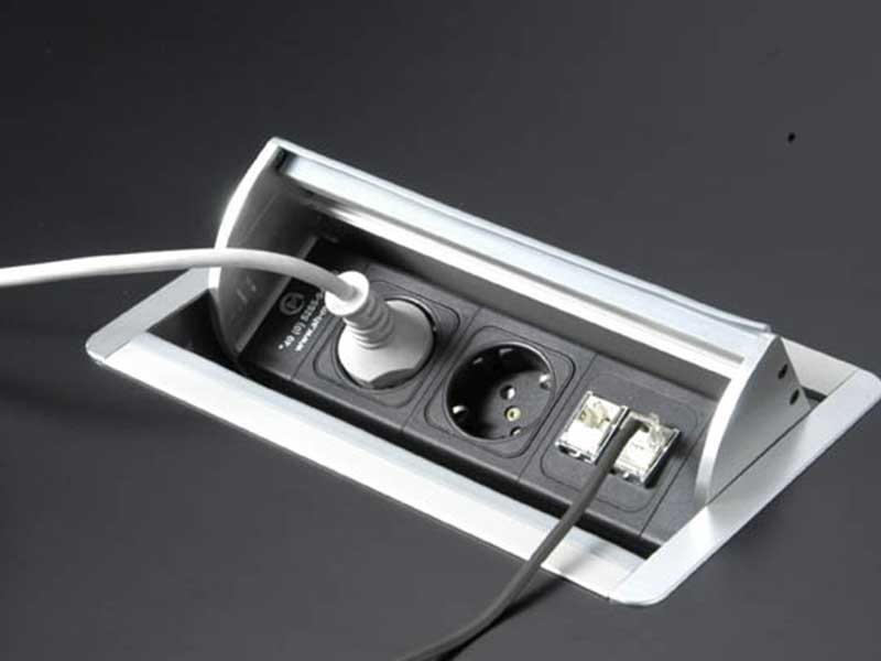 réalisés en aggloméré de 18 mm d’épaisseur revêtu de décor papier imprégné de résines mélaminiques, et bordés en ABS massif d’une épaisseur de 2mm arrondi. Sur les plateaux, après perçage, des accessoires (en option) peuvent être insérés, utiles pour le passage des câbles électriques comme le simple clapet en ABS d’un diamètre de 80 mm ou la tour de dérivation escamotable, ou encore la boîte porte-prises munie d’un couvercle et le boîtier passe-câbles